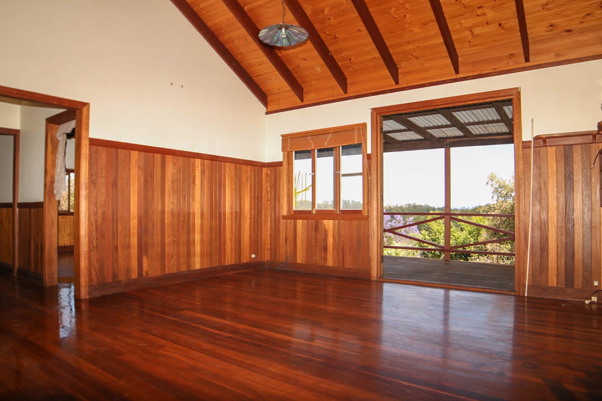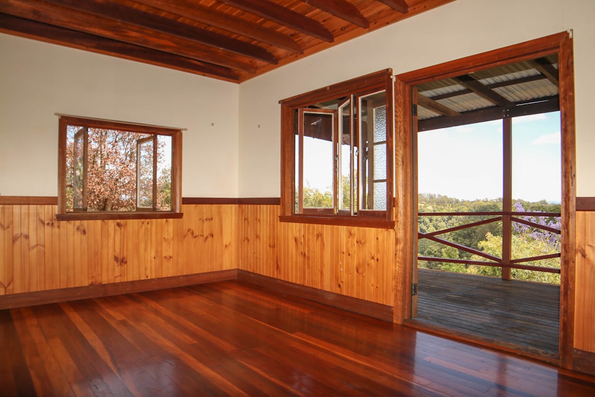 From the master bedroom and living/dining you have direct access via french doors to the wrap around verandah. Featuring uninterrupted views to Nimbin Rocks, the Border Ranges and Mt Lindsay, the verandah offers a place of peace and wonder. Polished timber floors, raked ceilings and quaint stained-glass windows all complete the style so popular within the