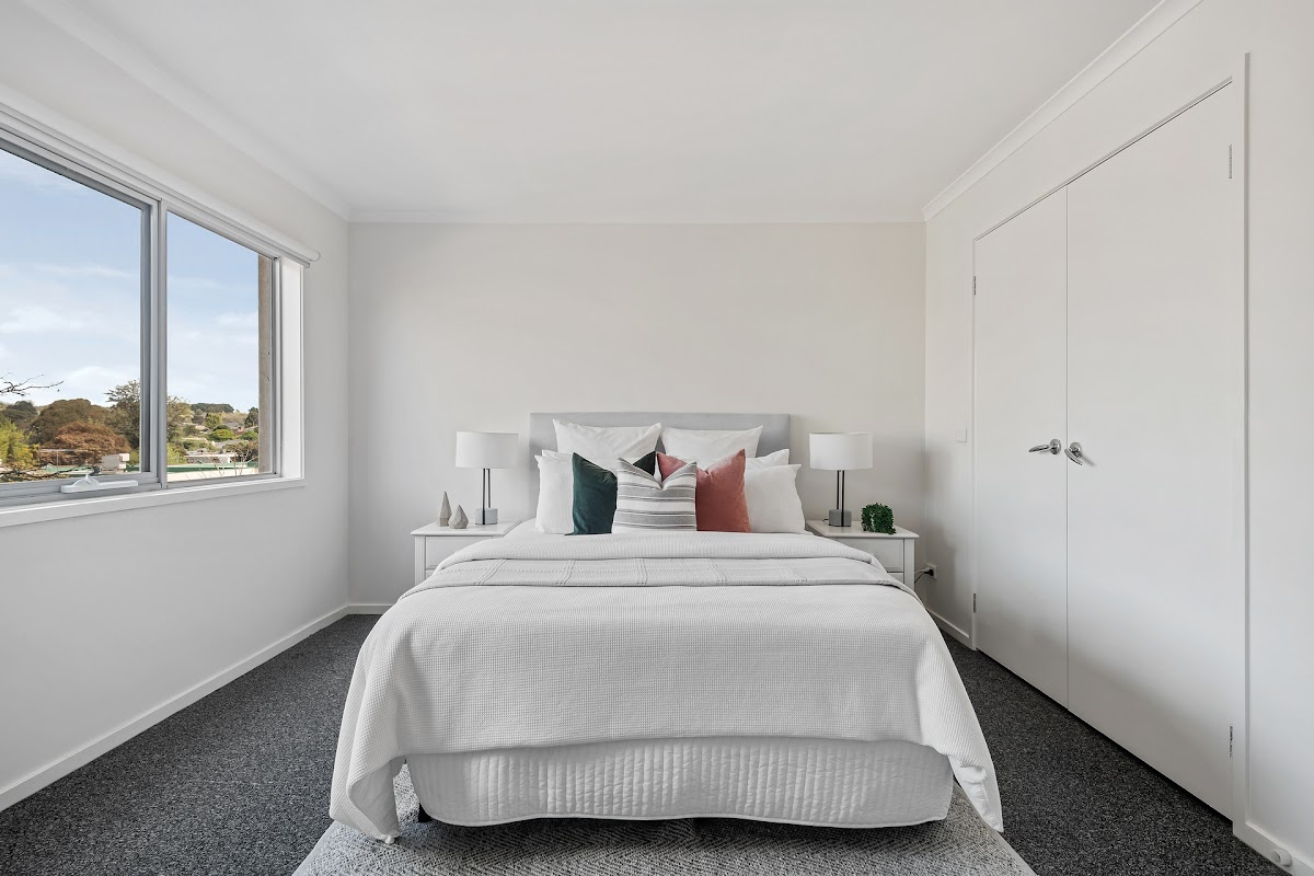 Two carpeted bedrooms with double-door built-in wardrobes are situated on this floor of the residence. One of the bedrooms opens to the front balcony, while the other contains ensuite-effect access to the bathroom.