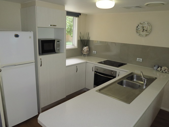 • Fully equipped u shaped kitchen with white benchtops and electric cook top