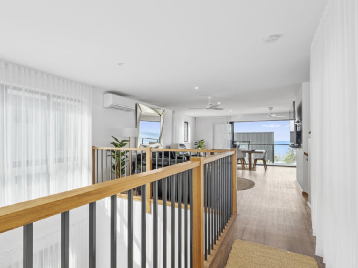 The upper level showcases light-filled open plan living flowing seamlessly to a stunning balcony with panoramic coastal views. A designer kitchen with Caesarstone waterfall island, 900mm oven and cooktop, walk-in pantry, and generous dining space creates the perfect hub for entertaining.
