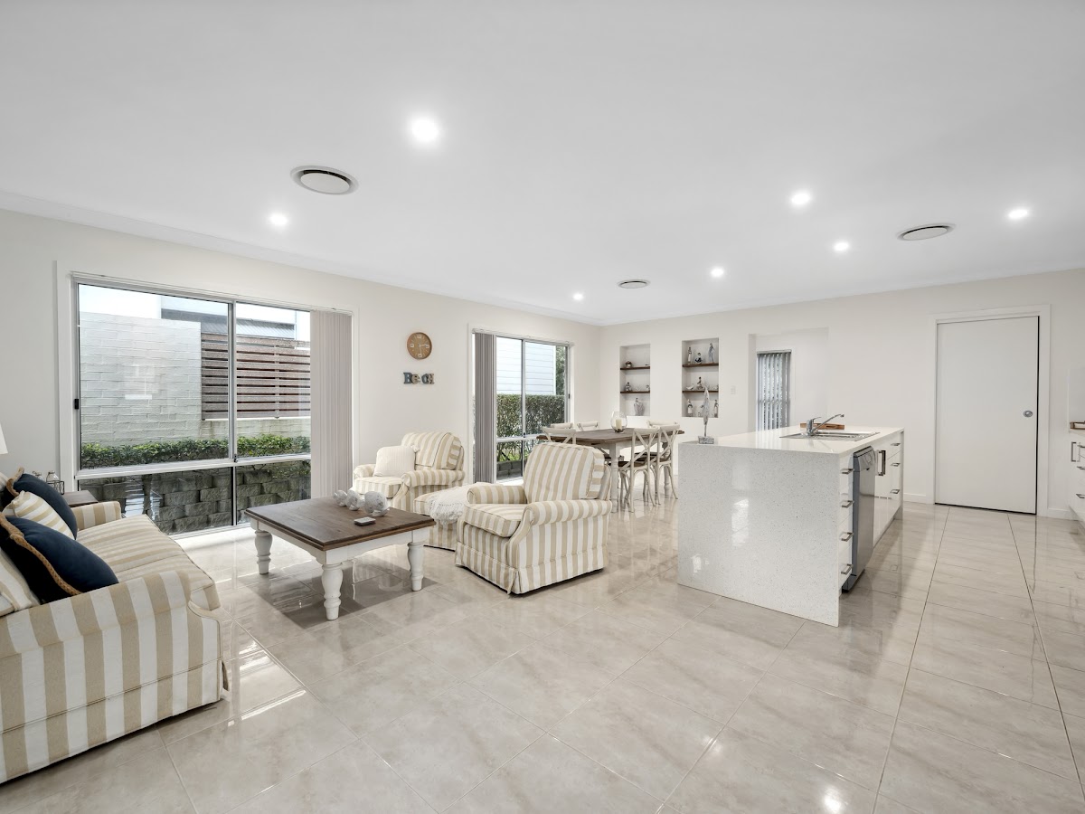 The home features three spacious bedrooms, including a luxurious master suite with its own private ensuite and walk-in wardrobe, ensuring comfort and privacy. The versatile layout includes multiple living areas, perfect for modern family life. The gourmet kitchen is a chef’s delight, equipped with Smeg appliances, ample storage, elegant stone benchtops, and seamlessly connected to the living spaces. Open up the glass stacker doors to your outdoor entertaining area and the home becomes an expansive layout, ideal for hosting special occasions with friends and family.
