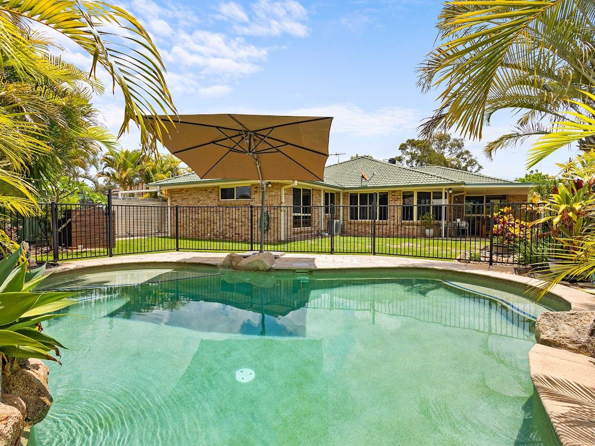 You’ll be impressed with this immaculately maintained 4 bedroom (three being “doubles” at or over 4m x 3m) & study home on an elevated 827 sq.m. block in one of Albany Creek’s most sought after streets. It boasts stunning views across Albany Creek to the Eaton’s Hill water tower, mountains and beyond from the wide front and side verandahs, and through the large picture windows in the formal areas. The northerly aspect also allows for cooling summer breezes through all of the spacious air-conditioned living areas (lounge, meals and the enormous family room), and perfect North-easterly aspect through the generous alfresco and across the large level yard and private in-ground pool. From the spacious gourmet kitchen, with its wide stone benchtops, 2-pak cabinetry, 2 door pantry & pyrolytic stainless-steel oven, you are central to all living areas, and you can look out over the alfresco, yard and pool areas, and enjoy those same cool summer breezes.