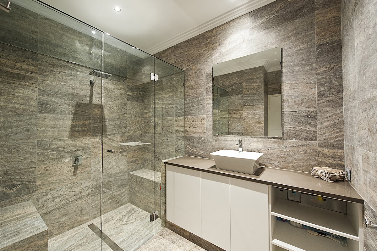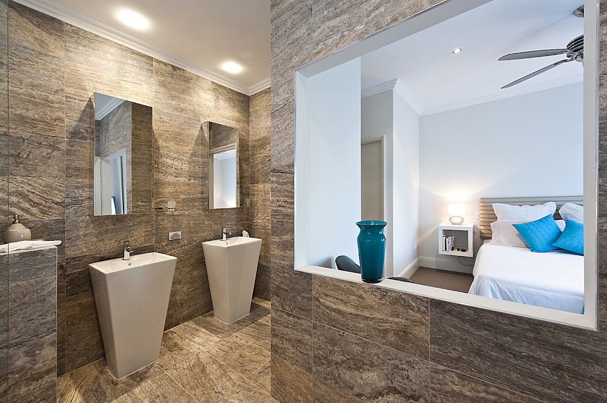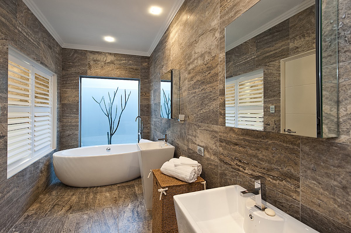 With the freestanding bath looking outside, the plantation blinds, unique double vanities and use of tiles this is your dream bathroom.