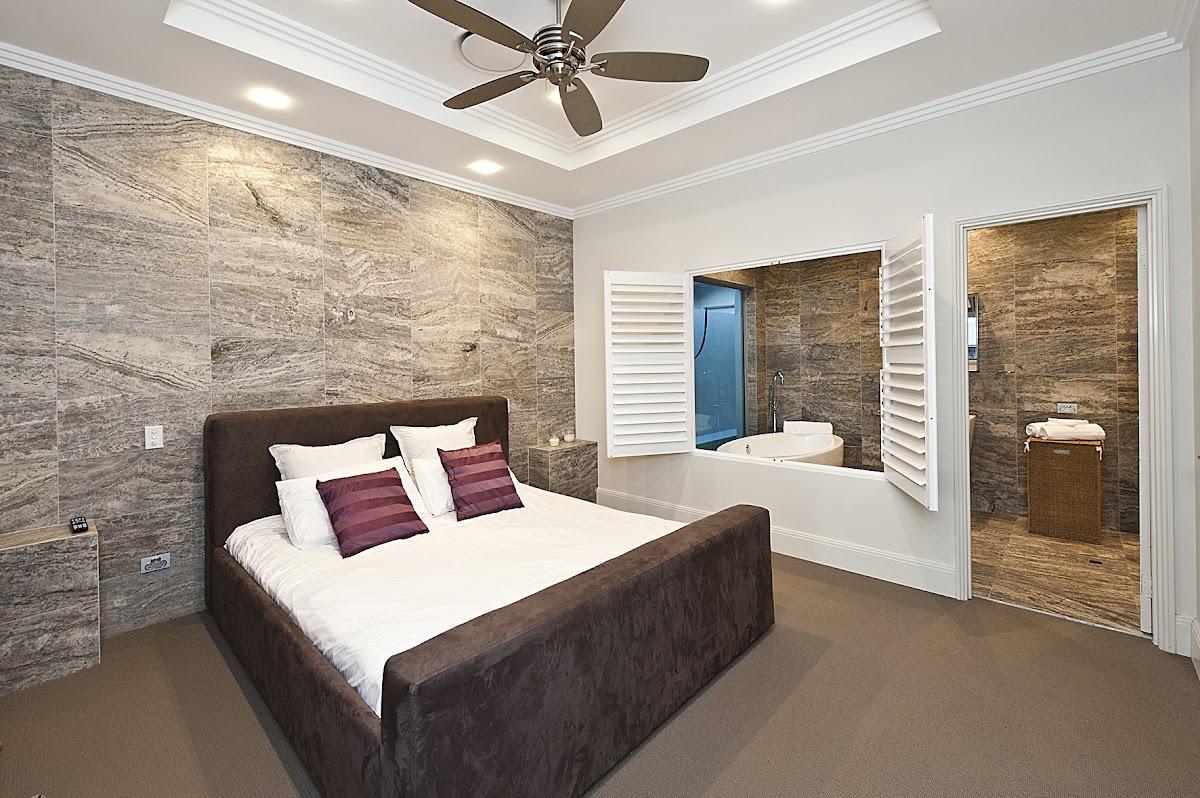 The master bedroom is simply divine. It continues the stunning travertine tiling theme and is positioned to have access to the alfresco/balcony with spa taking in the water views and all accompanied by the breath taking en-suite.