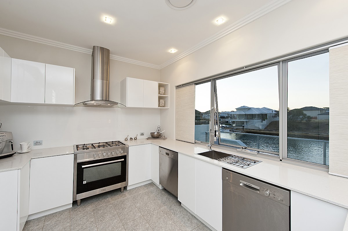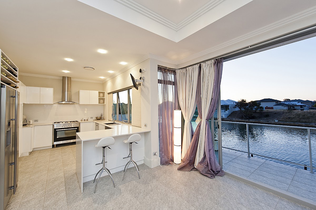 Then you enter the impressive main living area plus modern kitchen all taking in the beautiful water aspect with large stacker doors opening up onto the suburb balcony and alfresco area. The wonderful use of glass, natural light, window treatments, fans and tiles all combine to give it a real point of difference.