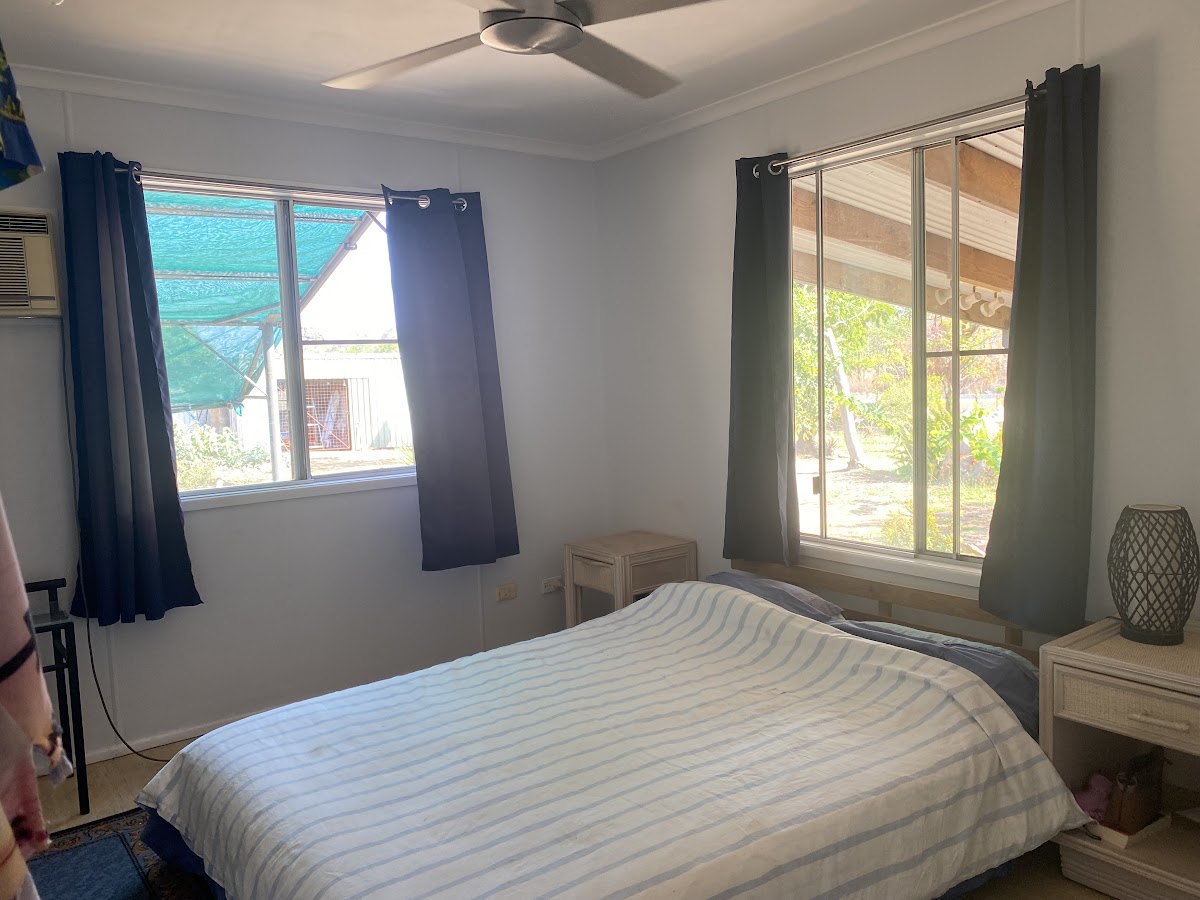 Two good size bedrooms at each end of the house. Functional kitchen with electric stove, pantry and everything you need and overlooking the back garden. The huge living room is unique with raked ceilings (with air-conditioning) giving a sense of space and ideal adjacent the kitchen and open to dining room. A full length patio along the side is perfect for entertaining in the unique BBQ repurposed from an old stove. This spot is lovely and cool with breezes all year round.