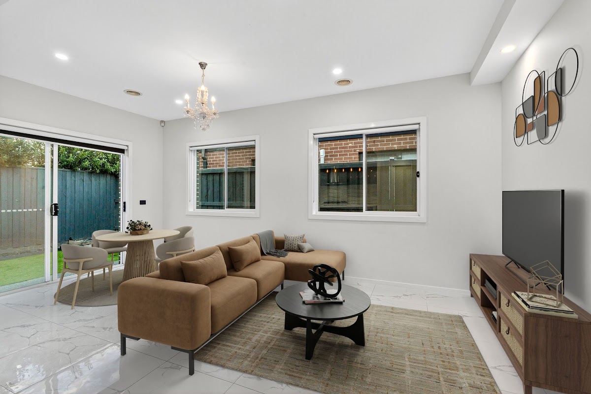 The home showcases a stylish brick façade, low-maintenance landscaping front and back, and a warm timber front door. Inside, you’ll find high-quality finishes including porcelain tiles, floorboards, and LED lighting throughout. The open-plan living area is filled with natural light, enhanced by a feature chandelier and seamless access to a sunny backyard — perfect for outdoor entertaining or peaceful relaxation.