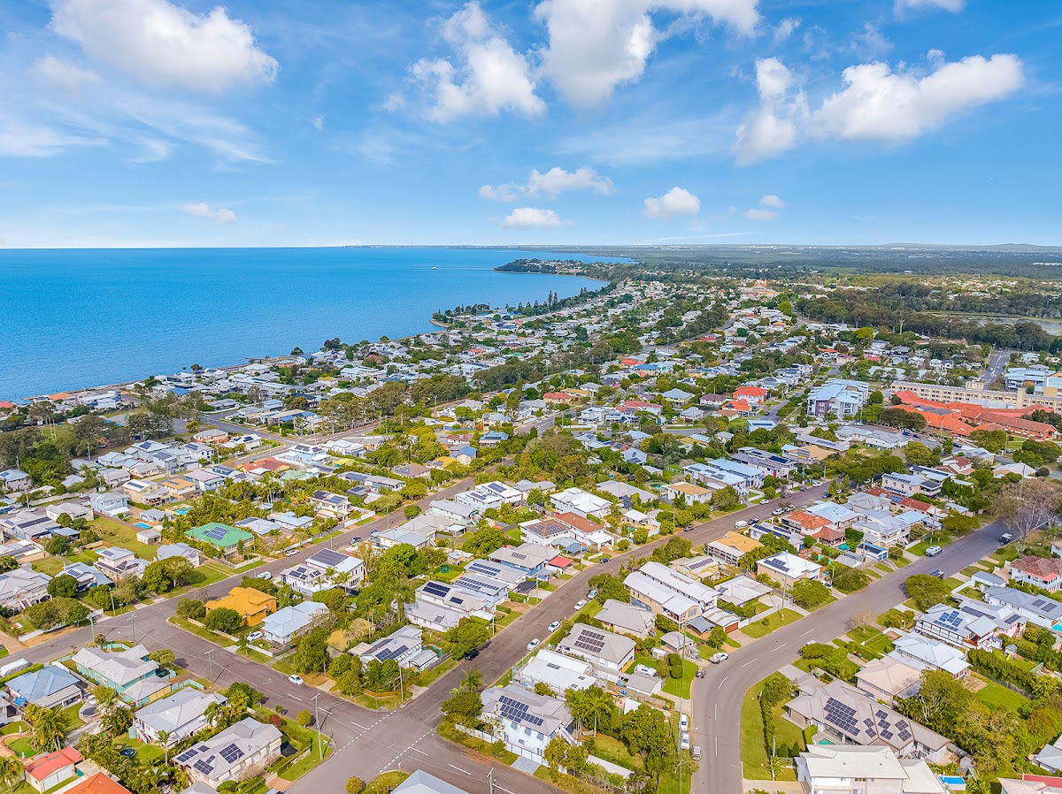Upstairs there’s 3 good sized bedrooms each with built-in robes and ceiling fans, there’s a large bathroom and a modern kitchen with adjoining dining and separate lounge flowing out to a rear deck. The deck overlooks the low maintenance back yard, and beyond to provide views of Moreton Bay.