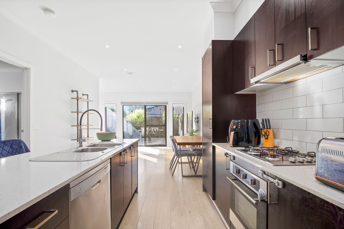Step inside to a welcoming entryway that leads to a bright and airy open-plan kitchen and living area. The modern kitchen is equipped with a gas cooktop, dishwasher, and ample overhead cabinetry, providing plenty of storage and functionality. Overlooking the lounge and meals area, it creates the perfect space for entertaining or unwinding after a long day. The living area, featuring elegant floating floors, flows seamlessly into the low-maintenance backyard, complete with an undercover deck and a garden shed for extra storage.