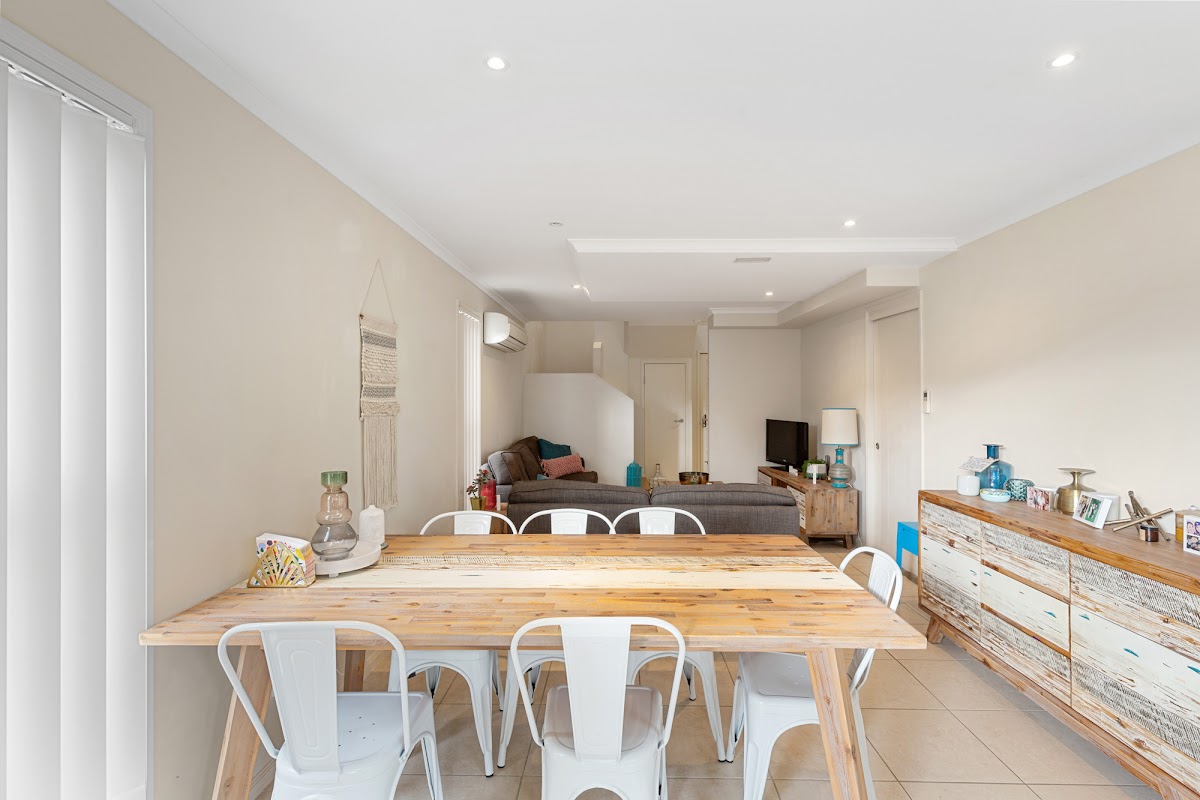 Open-plan living and dining area with air-conditioning and plenty of natural light and front security door.
