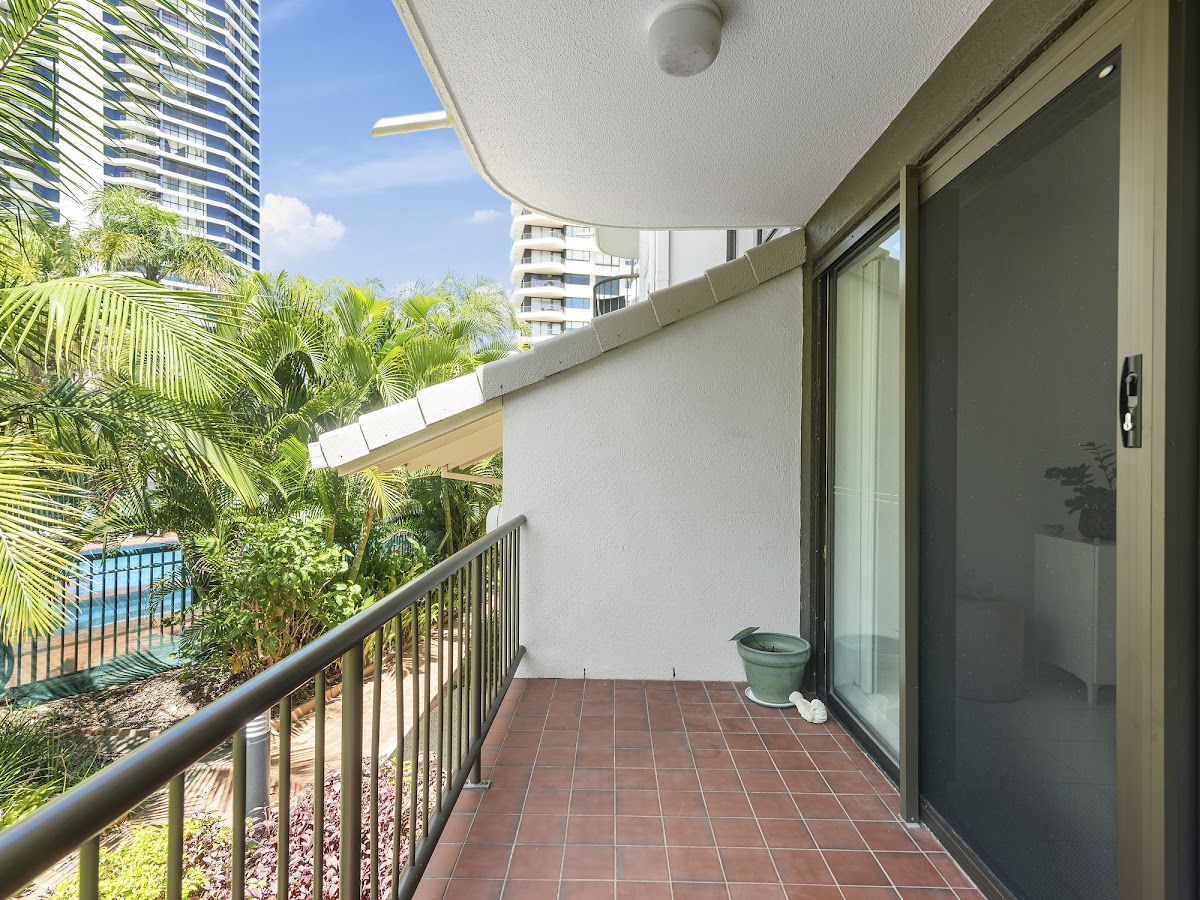 – The spacious living area opens out to balcony a leafy outlook, gardens and pool