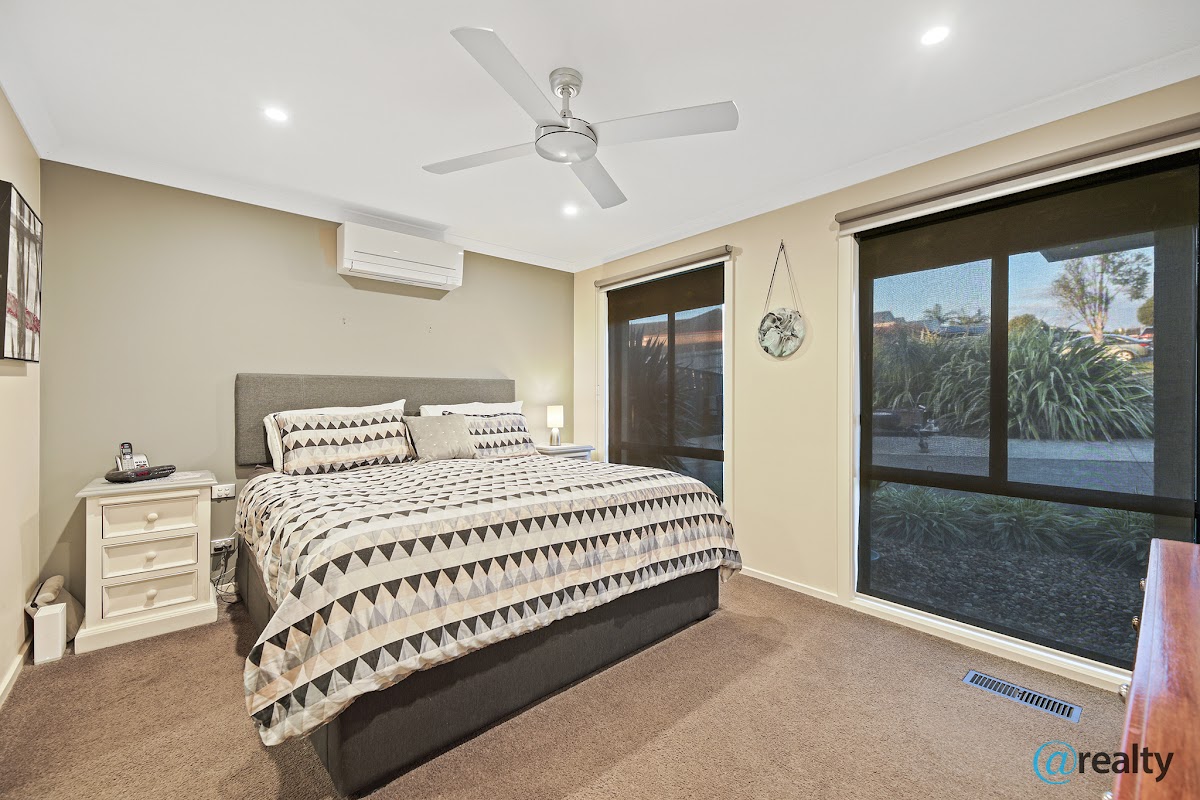 Upon entry, you’re instantly taken back by the natural light this home provides. The main bedroom boasts quality fittings, ceiling fan, electric roller shutters, walk-in robe with built in drawers, and well-appointed ensuite, whilst the remaining 2 bedrooms also come complete with ceiling fans and built in robes, both centrally positioned to the family bathroom comprising of separate bath, shower, single vanity and separate toilet.