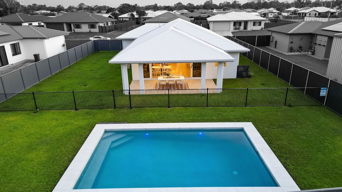 Central living areas transition effortlessly to an expansive covered patio through six stacked sliding doors, creating a seamless connection between indoor and outdoor spaces. The sparkling in-ground pool, equipped with a Naked filtration system, is surrounded by manicured lawns and privacy fencing, providing an ideal setting for entertainment.