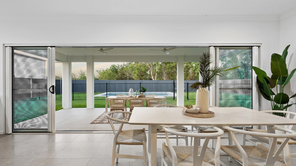 The stylish design features a neutral colour palette and high ceilings to enhance space and light while attracting cooling breezes. The open layout connects a spacious lounge, kitchen, and dining areas, making it ideal for family time and entertaining. The kitchen offers stone benchtops, a double sink, ample storage, and a practical pantry with slide-out drawers for easy access.