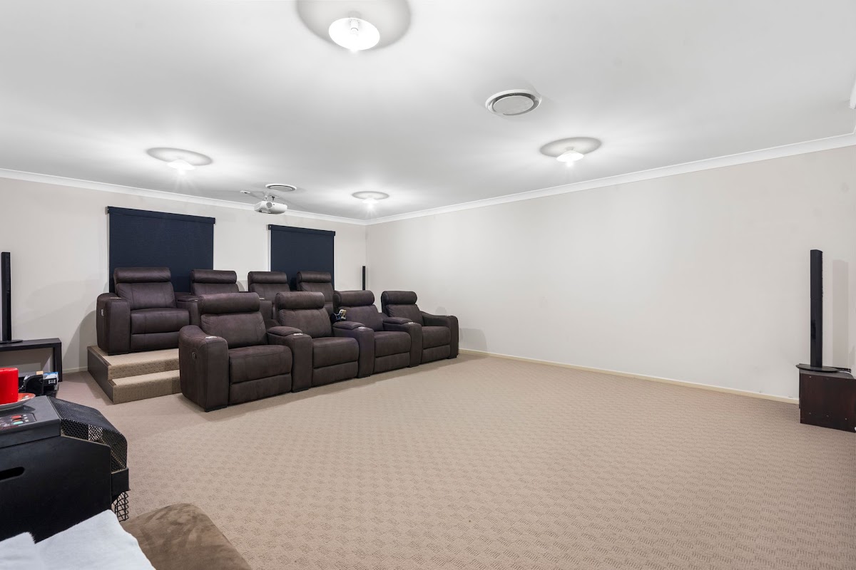 * Enormous soundproofed media/cinema room, with built-in projector, motorised retractable screen and staged seating platform