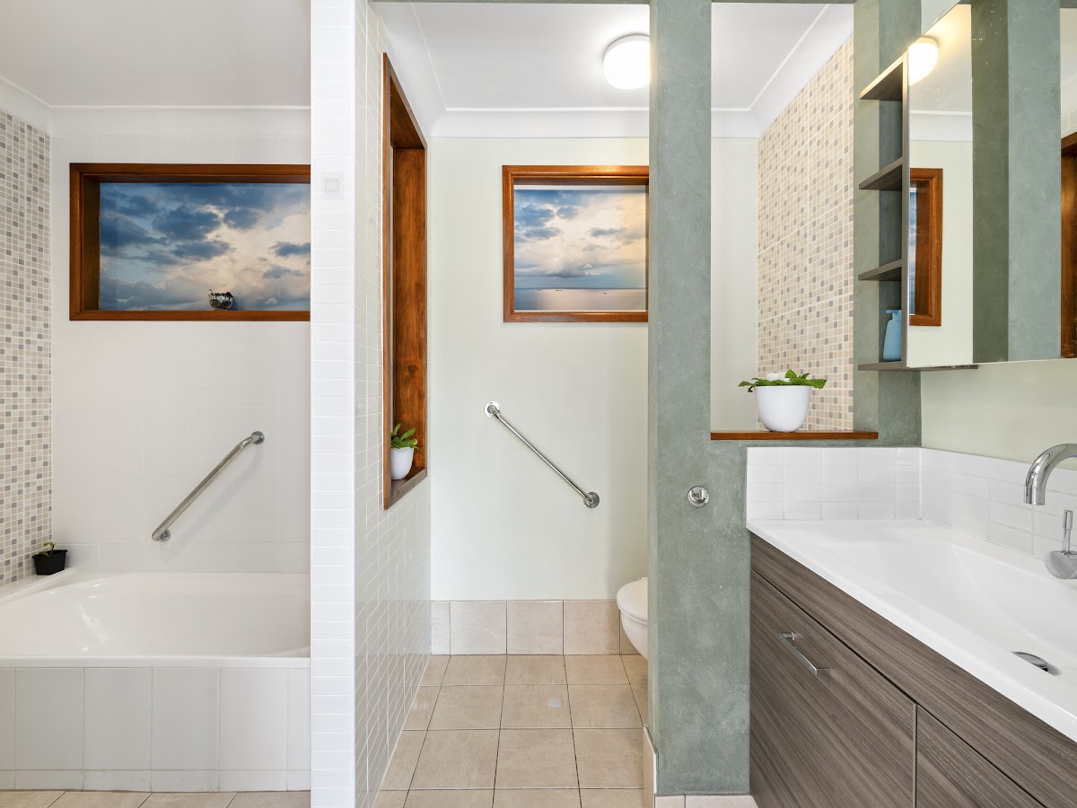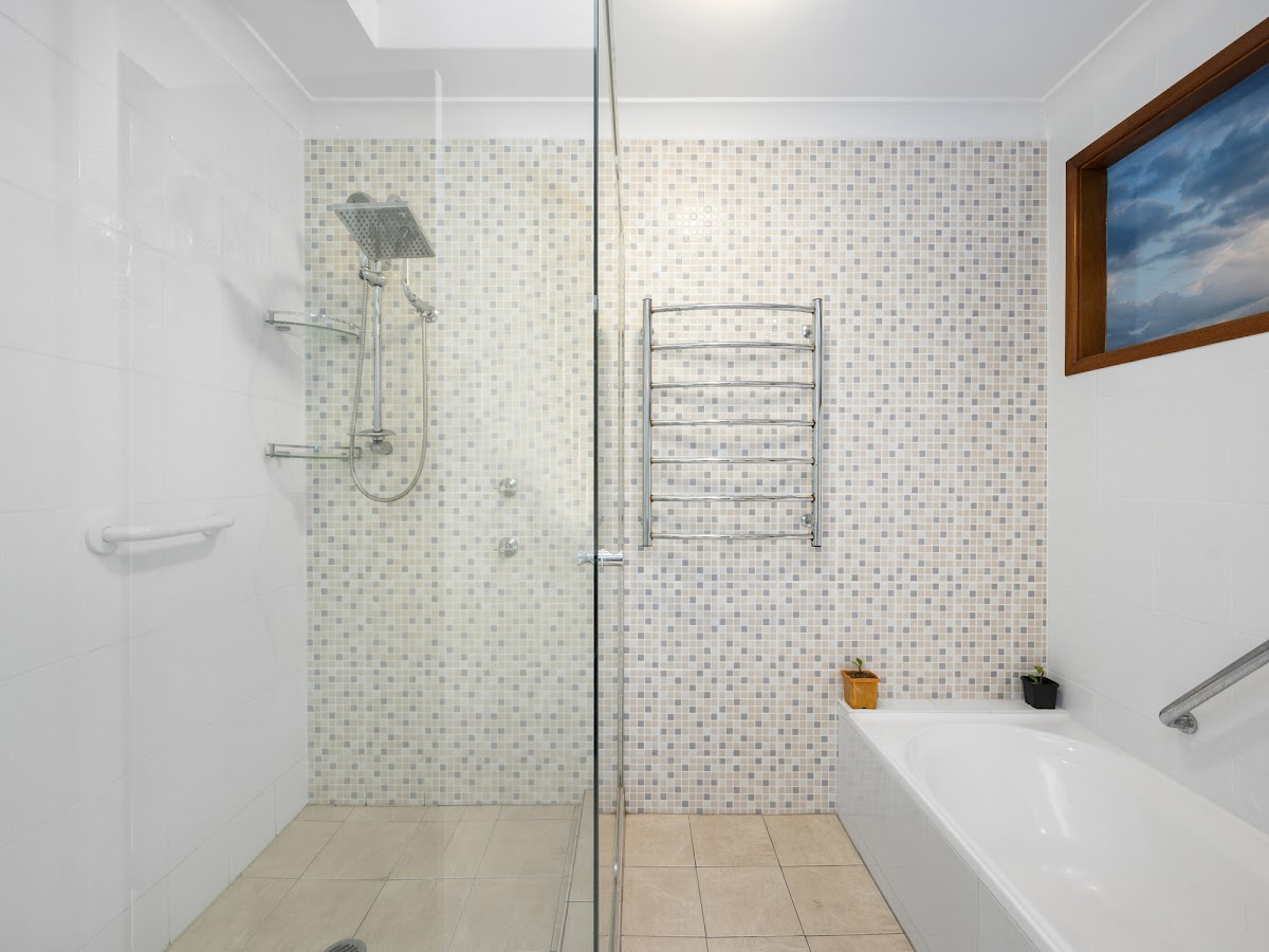 The main bathroom features a skylight, bath tub and shower also there is a second bathroom that features a ensuite thats combined with the laundry.