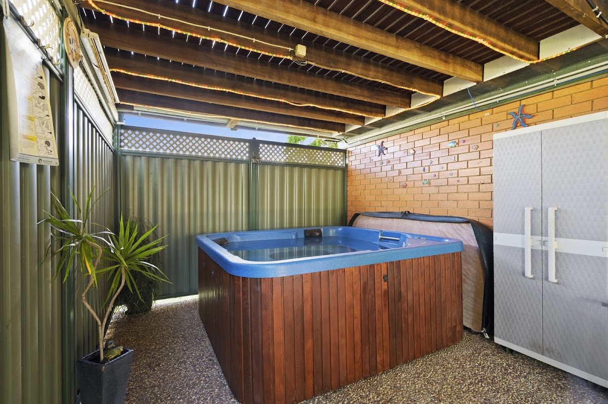 The property features 2 bedrooms upstairs with the 3rd bedroom converted into a huge walk in robe and dressing room off the master bedroom. however, this could be converted back into a 3rd bedroom if desired or a nursery. All windows at the front and sides of the property have roller shields. Downstairs there are two utility rooms that could be used as a study or reactional rooms and there is also car accommodation with plenty of storage space. Leading out under the back deck you have a totally fenced off, extremely private area with a 8 seater spa to relax in after a hard days work. What a perfect way to end your day especially with your favourite beverage!