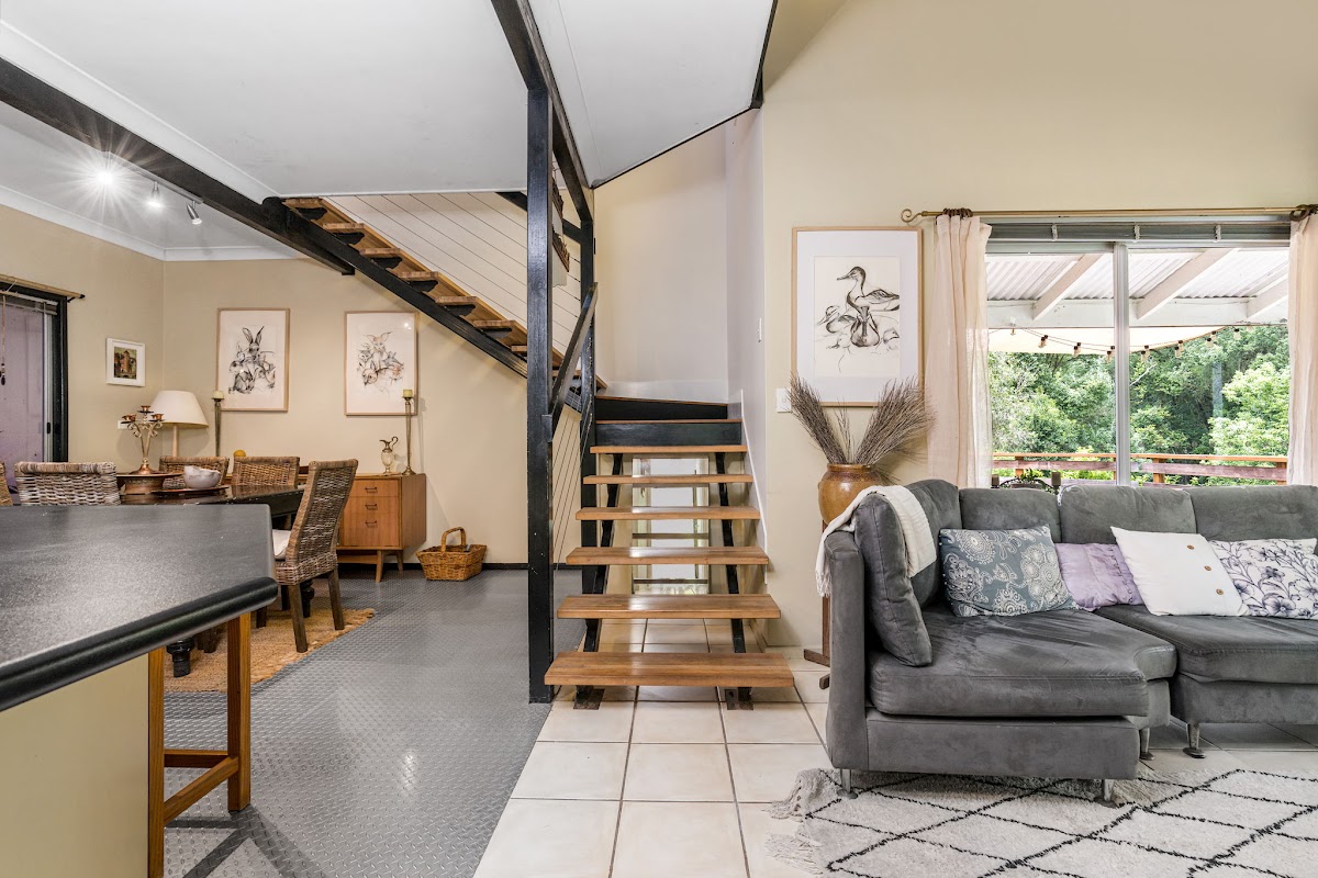 Escape to your own private, completely flood free paradise! This uniquely designed tri-level home offers a lifestyle of tranquility, abundance, sustainability, and exceptional organization. A perfect blend of comfort and character, ideal for families or multi-generational living, this property boasts six bedrooms. Every bedroom features built-in, floor-to-ceiling wardrobes, maximizing space and organization. There is also a loft suitable for a playroom, home office, extra guest accommodation or a creative space. The top two levels are freshly, professionally painted. There is a separate, fully sound-proofed and insulated stunning open-plan artist studio with breathtaking views of the property’s centerpiece: a magnificent, natural swimming hole and babbling creek. Imagine lazy afternoons spent cooling off in your own private oasis! As well as two bathrooms there is an additional outdoor shower with hot and cold water to rinse off after your swim. The main bathroom is designed for optimal organization, with floor-to-ceiling built-in storage. The interior is filled with fantastically interesting architectural features, and provides an abundance of storage including clever, built in under- stairs storage on two levels. ( Perfect for Harry Potter fans!) The upstairs, main lounge room features an entire wall of floor-to-ceiling cupboards ensuring a streamlined, clutter free space. The kitchen is equipped with a Smeg induction cooktop, a pyrolytic, self cleaning, programmable steam oven and a Fisher & Paykel double dish drawer perfect for the home chef to create gourmet meals with easy clean up. The large combustion fireplace creates a cozy ambiance and keeps the entire home cosy and warm on crisp winter nights. For the avid gardener or those seeking a sustainable lifestyle, the private half-acre established orchard is a dream come true. Over 50 mature fruit trees dot the entire property including mangoes, Tahitian limes, oranges, lemons, bananas, bay leaf, curry, and an absolute abundance of fresh herbs providing a year-round harvest of fresh, delicious produce. The property boasts incredible views of Sphinx Rock and the Nightcap Ranges. Take advantage of the sustainable features, including a high quality solar array, ready to connect to batteries and two 20,000 litre water tanks. The lower level has covered verandahs wrapping around the entire space, and a lower level courtyard offers a bbq/ pizza oven entertaining area with direct access to the kitchen. The bottom deck overlooking the waterhole is enormous, with views to the surrounding mountains and more than ample space for entertaining friends and family. There is also a spacious enclosed fire pit/ garden area plus courtyard with views to the mountain on the upper level providing yet another private space for family and friends. There are three separate sheds: one basement shed, currently used as a wine cellar and mushroom growing room, a shed in the orchard for all your gardening needs and a huge 40 ft fully roofed shipping container- mancave/she shack dream with workbenches and shelving providing more than ample space for all creative pursuits. There is also an oversized garage with automatic door, currently used as a rumpus room.This stunning home is built with durable Colorbond and beautiful Western Red Cedar.
