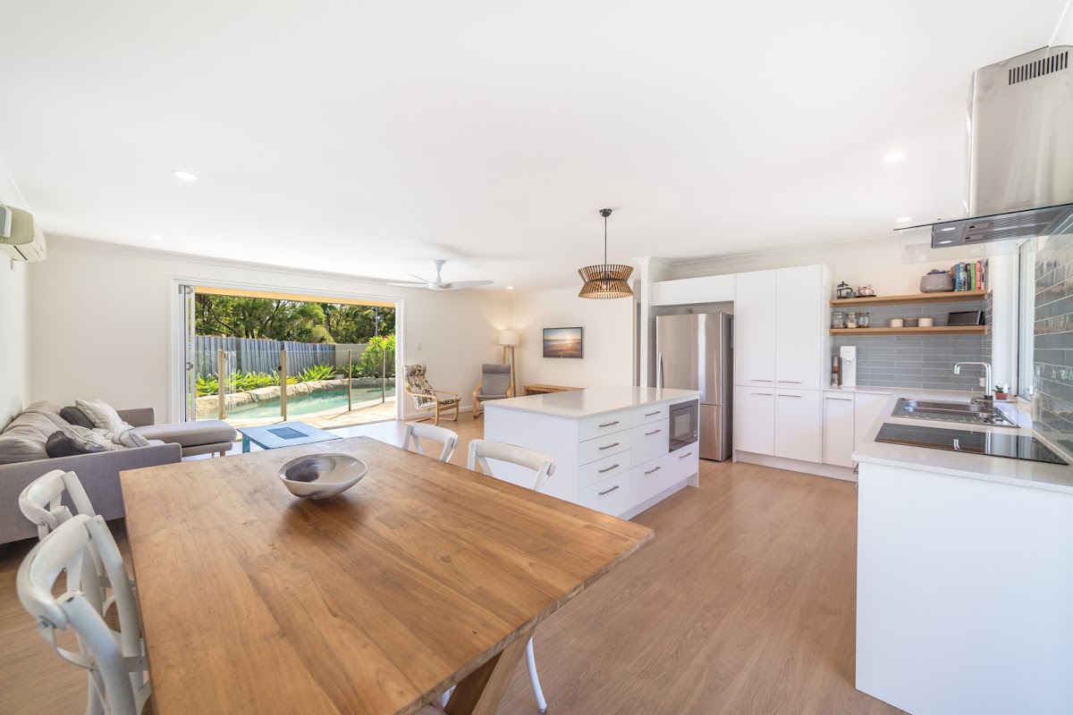 Newly renovated open plan living and dining areas open out to the pool via large bi-fold doors. The stylish kitchen is designed for easy entertaining and the busy demands of daily family life and features stone bench tops, large island bench and new stainless steel appliances.