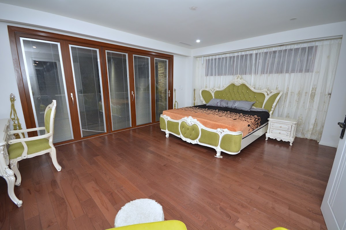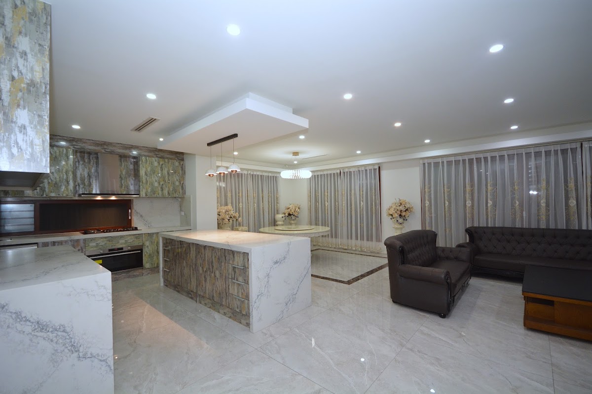 1.2m x 1.2m marble tiles downstairs, solid teak floors upstairs, teak staircase