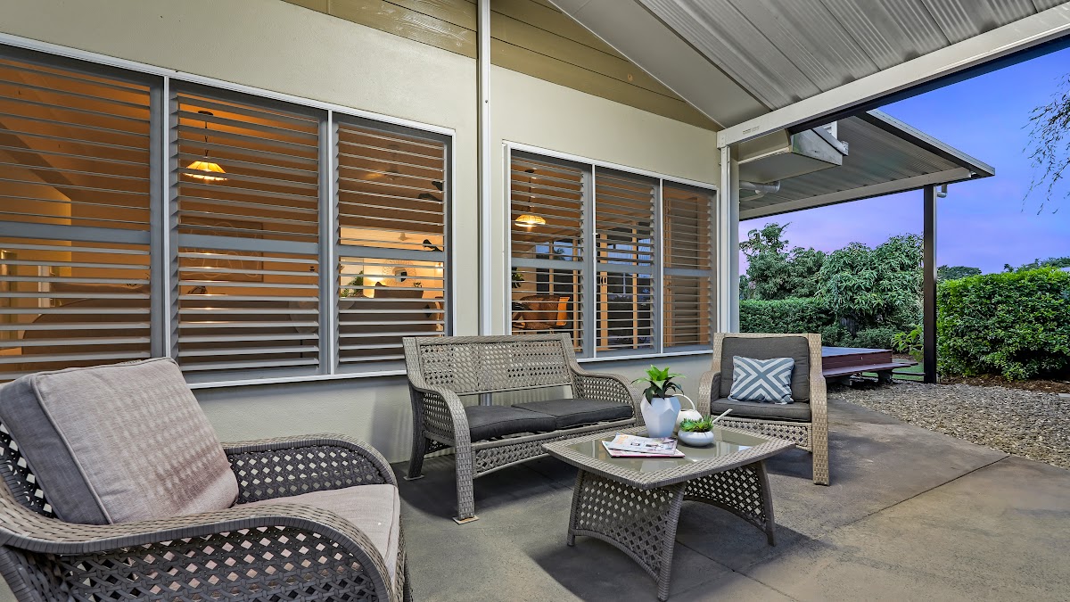 – Internal living spaces flow through numerous sets of striking bi-fold louvre shutters along two sides of the home, offering a seamless transition to an outdoor patio and separate oversized and covered timber deck with cooling ceiling fans and tasteful garden screens, overlooking privately hedged lush green lawns and a stunning view of Walshs Pyramid