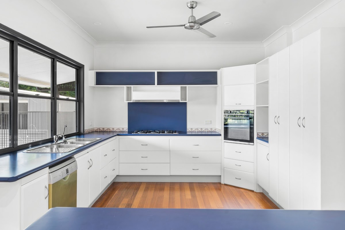– Combined kitchen with ample storage and dining area opening onto rear entertaining deck with a picturesque view of the