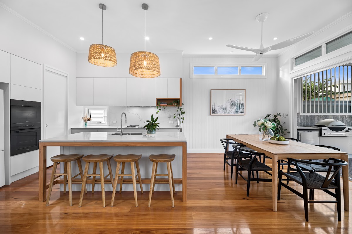Orientated with blissful water views over Cabbage Tree Creek, a stunning reimagination has transformed this circa 1880’s workers cottage with a luxe contemporary extension designed for relaxed family living. Overlooking the customary white picket fence, shaded by the poinciana tree and with sea breezes all year round, you will either entertain or relax as you take in the sights and sounds of the foreshore from the verandah entry.