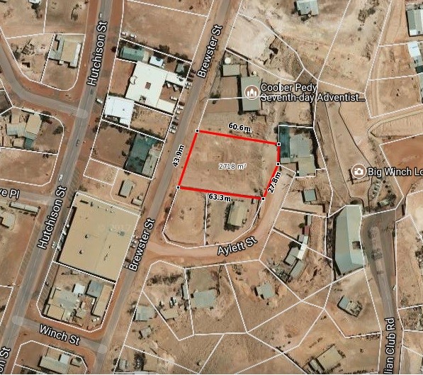 Consisting of a significantly large freehold block of land, of 2,718 Sq M approx. in size. It is situated immediately adjacent to the CBD area behind the supermarket with commercial and retail outlets nearby. The property is elevated and provides interesting views. Brewster Street runs parallel to Hutchison Street, the main street of Coober Pedy.