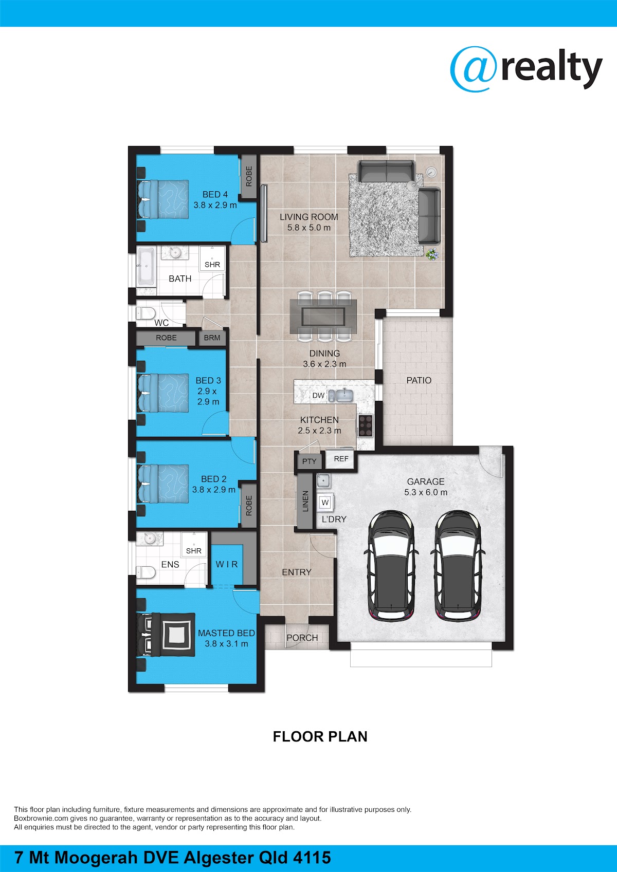 • Four bedrooms, all with built-in wardrobes and ceiling fans; master bedroom includes air conditioning