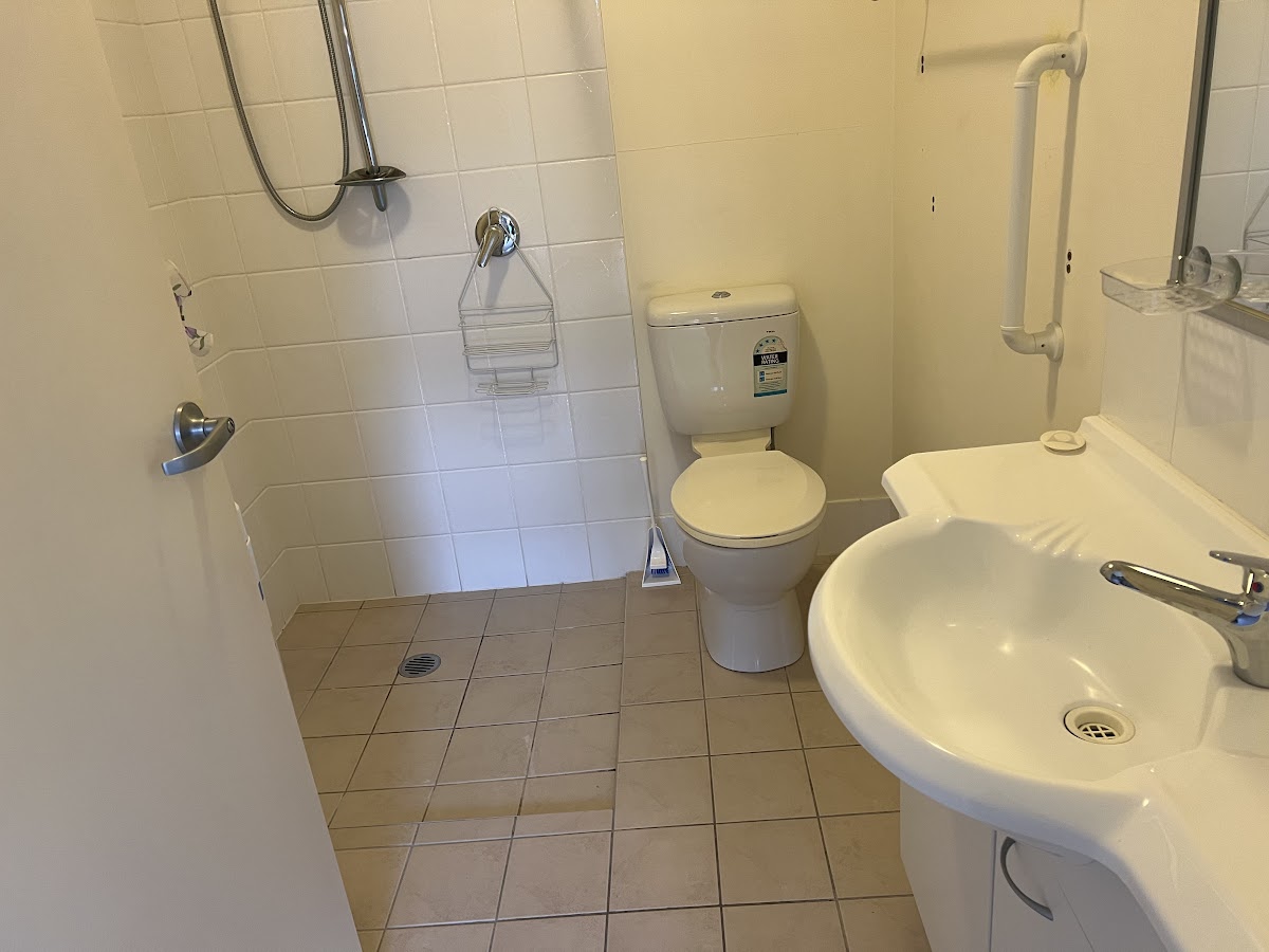 4. The combined bathroom and laundry is positioned off the bedroom – with a large open shower, vanity and toilet. The laundry area is fitted with a single laundry tub, taps, and a washing machine