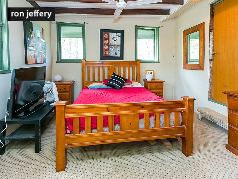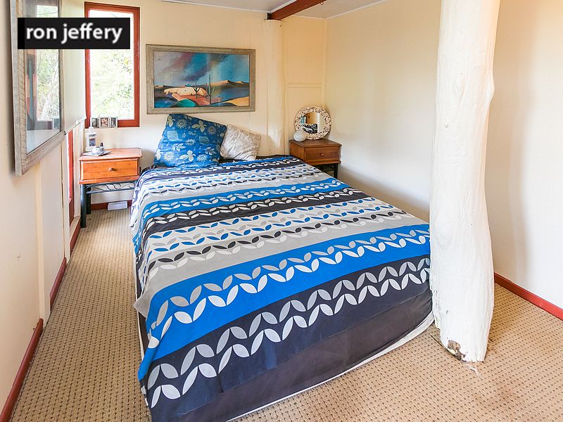 There are two upstairs bedrooms in the other pavilion. The main bedroom has the same feel, but with carpet on the floor. The other bedroom is more conventional. The deck certainly adds to the relaxed feel of the property. External stairs join the upstairs to downstairs. Downstairs has another bedroom and the bathroom. AND a quirky little studio. There is a shed on the property too!