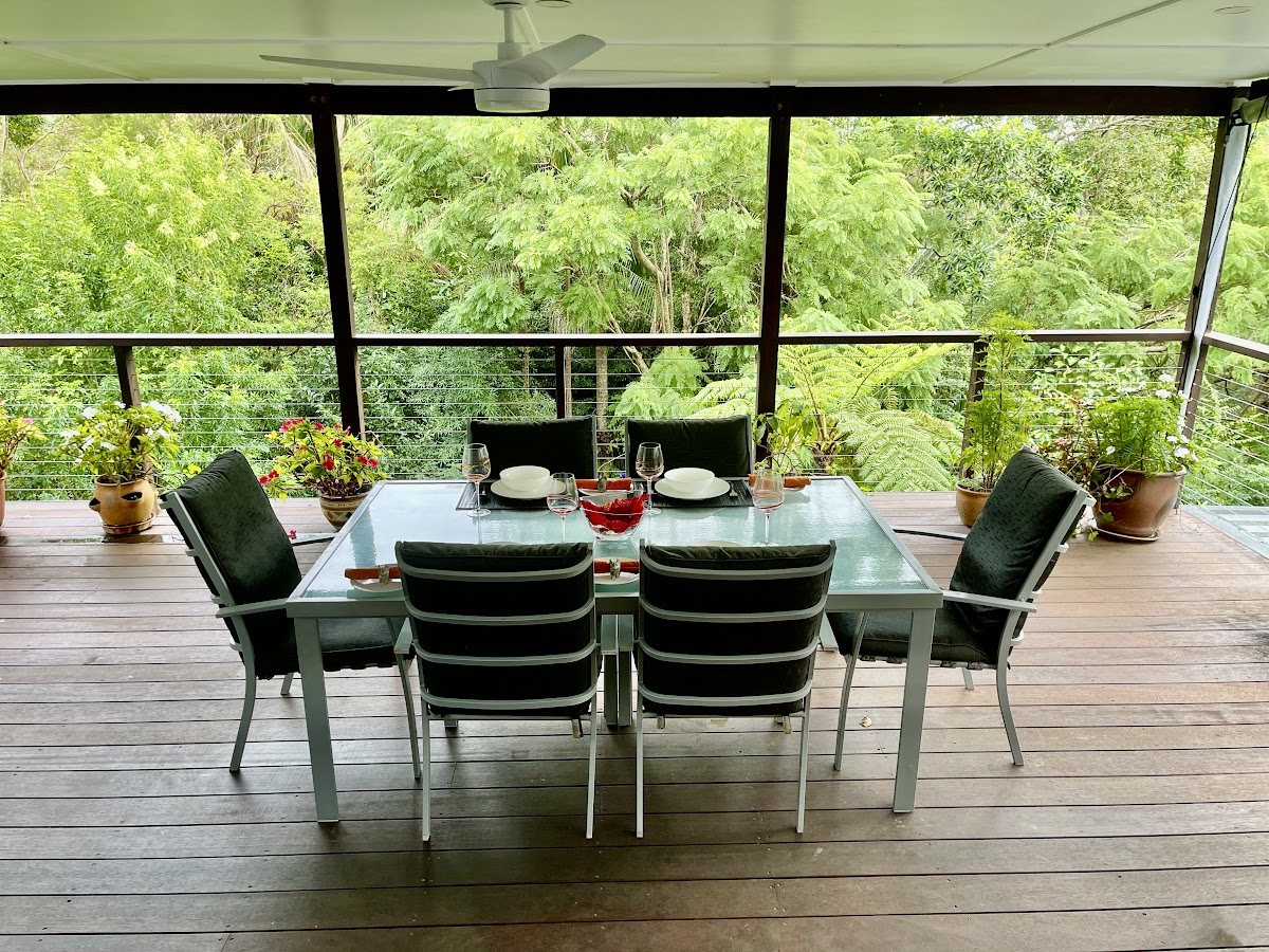 Nestled amongst the rainforest are self managing gardens and vegetable plots with a beautifully renovated QLD’er style home.