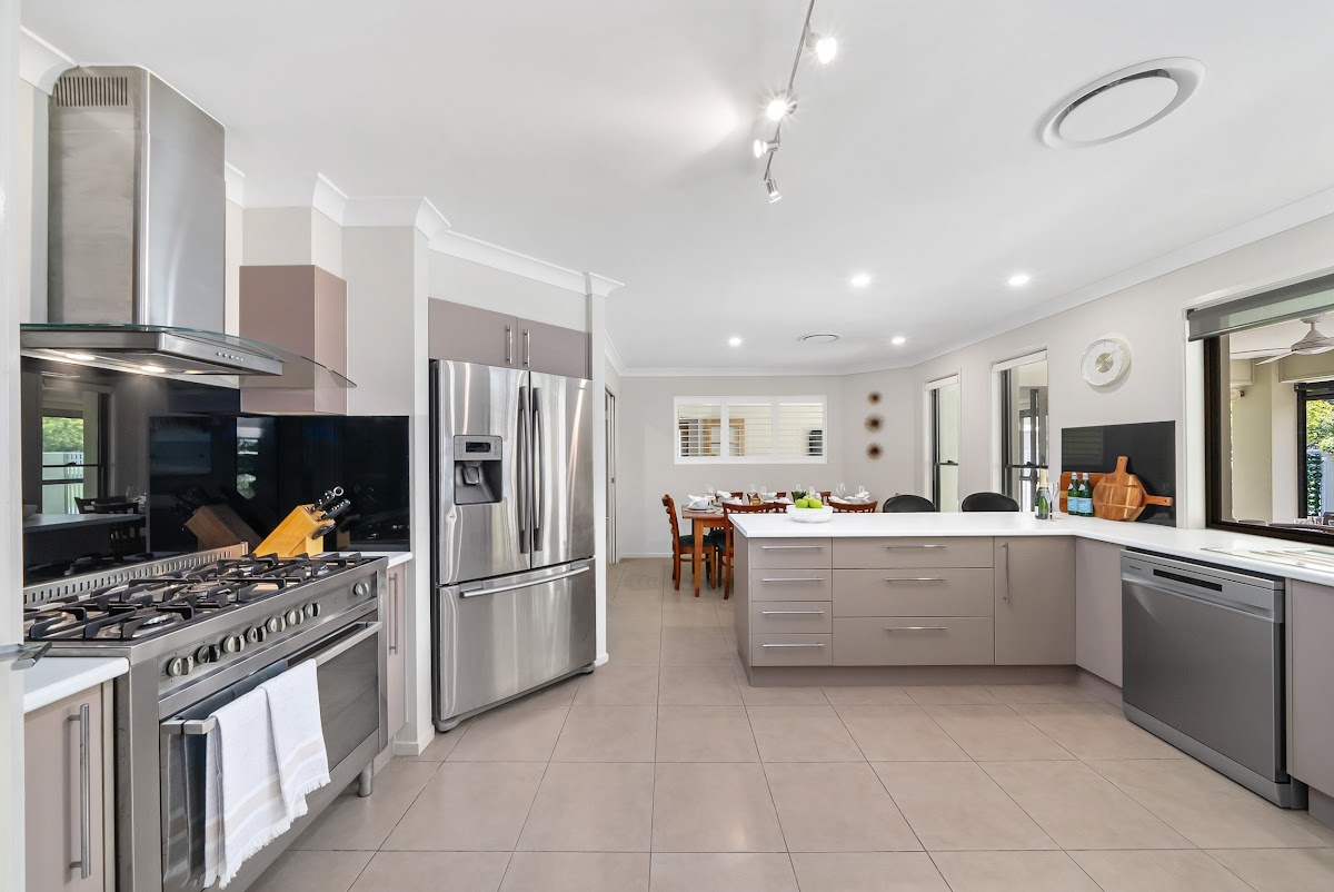 – Gourmet kitchen with ample bench space, fitted microwave, soft-closing drawers, and gas cooktop