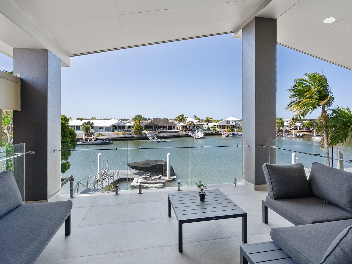 A large deck anchors the living and dining rooms where sliding doors open to the alfresco dining for relaxed outdoor entertaining. The indoor/outdoor living and dining, with water vistas, is supported by a lacquer-finished, out-door BBQ kitchen. The shallow beach effect pool provides the perfect foreground for your moored watercraft and the water views across the canal.