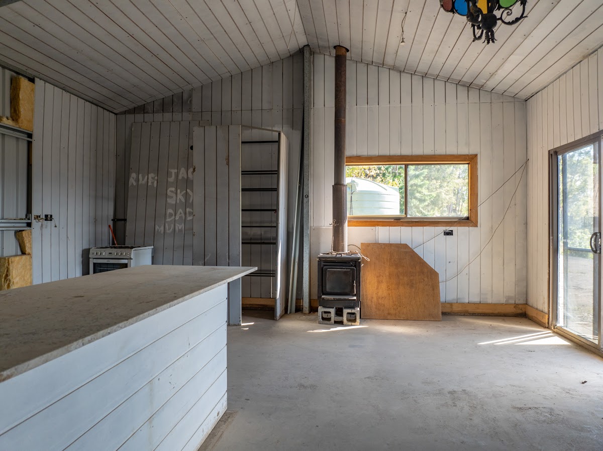 At the heart of the property is a large 6x18m Colourbond shed set on a concrete slab. While the interior has been stripped back, the essentials are in place, power + plumbing, there’s a cozy fireplace, and a stone benchtop has already been installed in the kitchen area. It’s a blank canvas, ready for someone with vision to bring it back to life.
