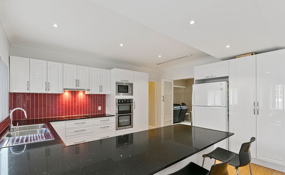 – Beautiful designer kitchen with stainless steel appliances and stone benchtop