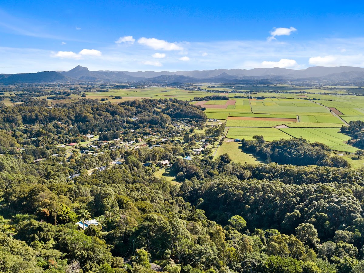 With 180 degree views of the Tweed Valley and Border Ranges from Mount Burrell in the south across magical Wollumbin to the Cougals and Camel Rock in the valley you will be mesmerised every day upon coming home and opening the front door to this. The home is a wonderfully inviting split level design which beckons you into the open plan, timber floored and raked cathedral ceiling featured family hub with a central wood fired hearth which warms your soul on the cooler winter nights.