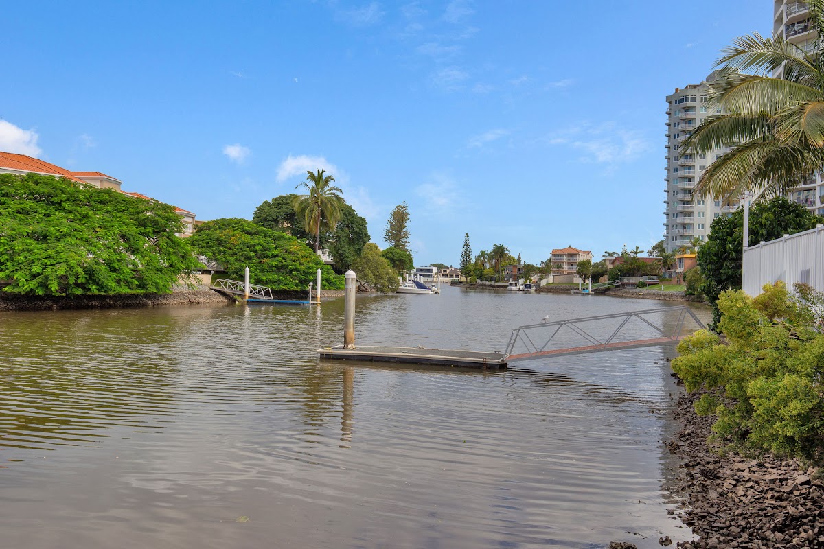 The building has an onsite manager, pool and spa, BBQ, tropical gardens, and a pontoon on the river.