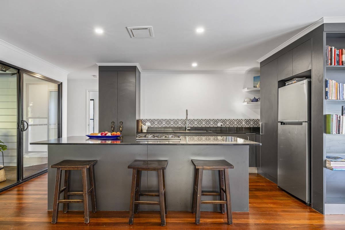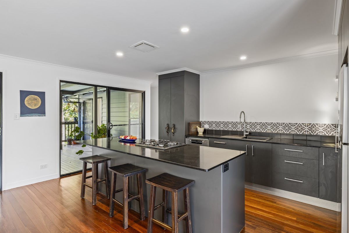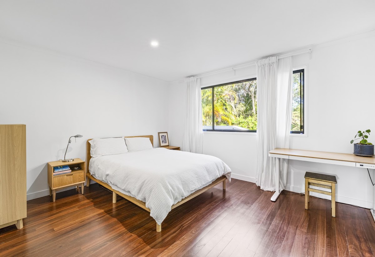 Upon arrival, you’re greeted by a tropical Bali-inspired entrance with a timber boardwalk that leads to an elegant pitched deck and double French doors. Step inside to discover polished timber floors throughout, with an immediate view from the front door to the back deck overlooking a peaceful park reserve. It’s your own private retreat with a holiday vibe, right at home.
