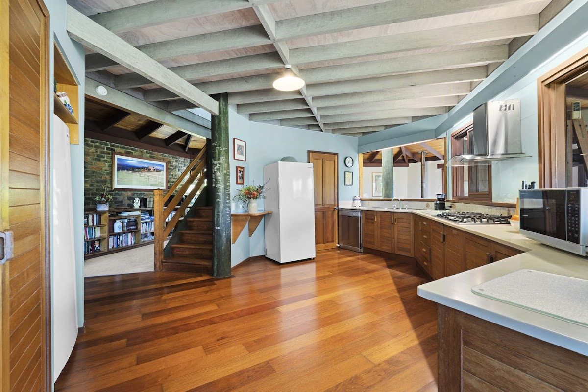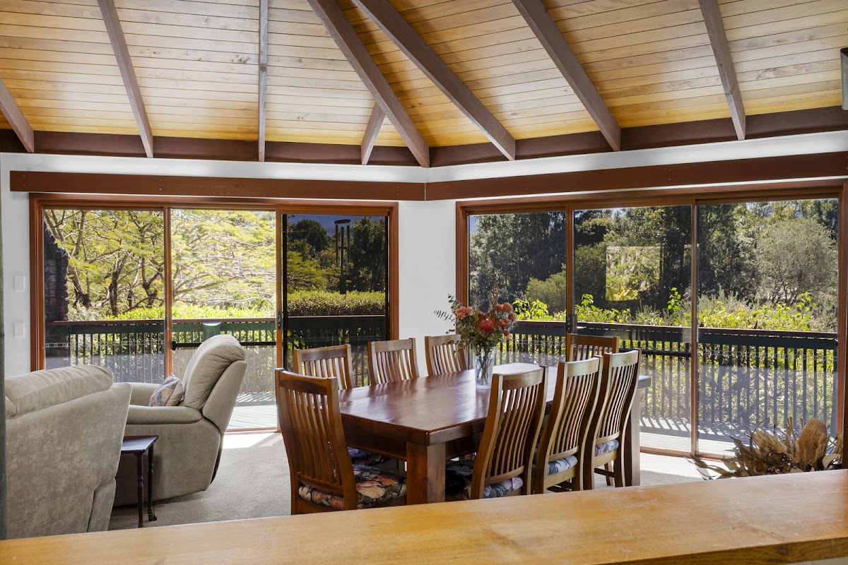 Lots of glass, natural timber cladding and flooring are main features. There is a combustion heater in the lounge/dining room from where you can access the north facing verandah which provides a warm space to relax in the winter sun and the summer breezes. There is also a large laundry/mud/sewing room.