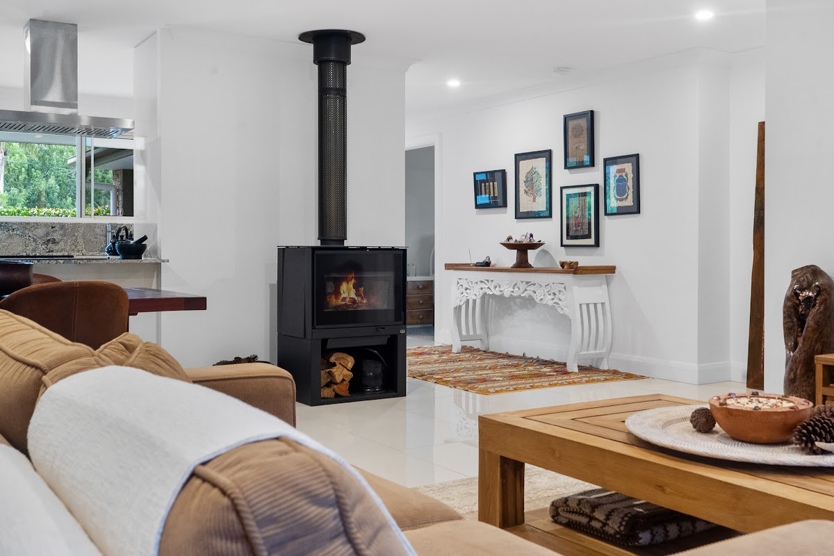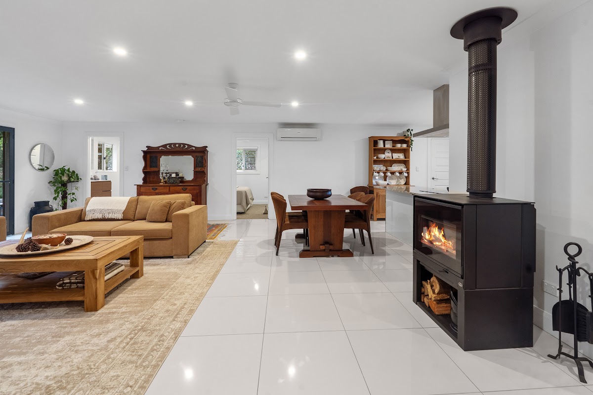 Polished porcelain tiles guide you through to the heart of the home and the light-filled open-plan kitchen, living, and dining areas are anchored by a combustion wood fireplace, creating warmth and ambience during the cooler months. Double timber French doors extend the space outdoors, opening to a partially fenced, private backyard with an abundance of herb plantings throughout.