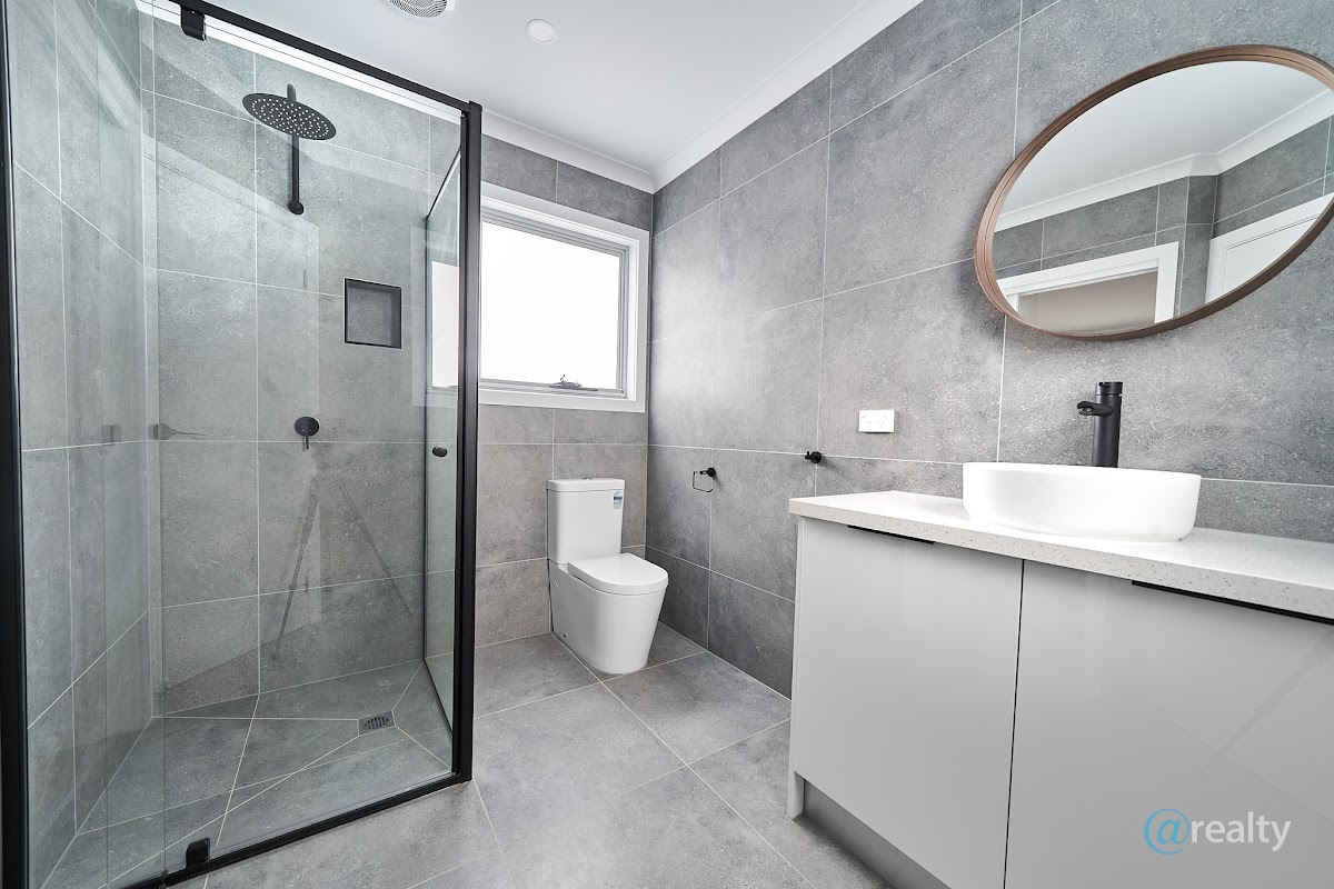The upstairs level’s two bedrooms share Upmarket bathroom with luxurious floor to ceilings porcelain tiles, quality fittings and semi-frameless shower screen, an equally stylish bathroom/powder room downstairs compliment this luxury townhouse.