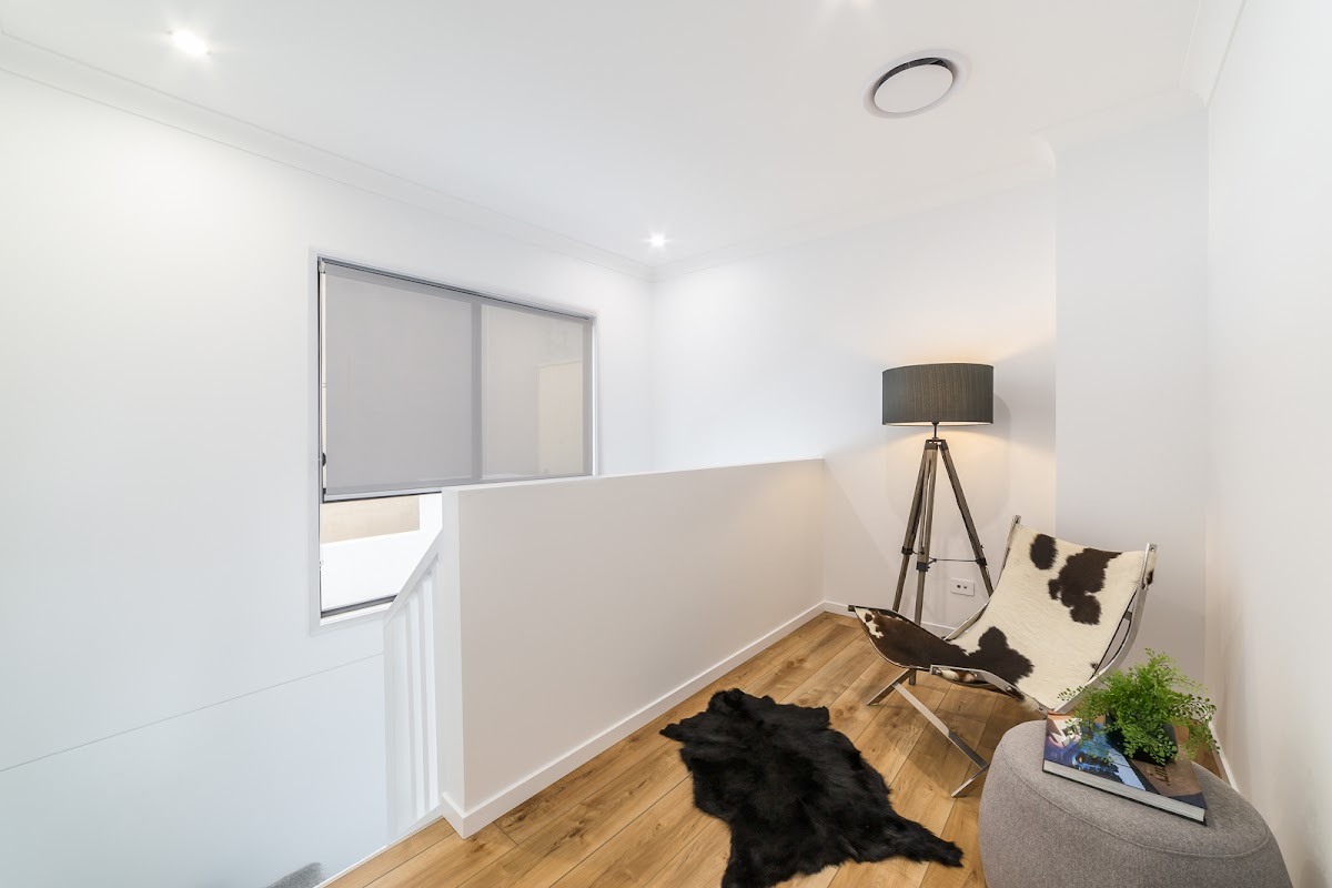 Three generous bedrooms on the first level, include a well-appointed master suite with luxurious ensuite with double vanities and large shower with rainfall shower head. A fitted walk-in-robe and private balcony complete this space. The 2 additional bedrooms feature mirrored robe doors, and share use of the large main bathroom that enjoys a deluxe fit out with stone vanity benchtops, full sized bath and separate shower. A study nook is also located on this level.