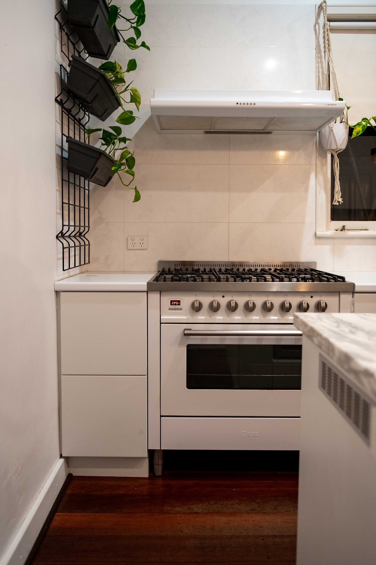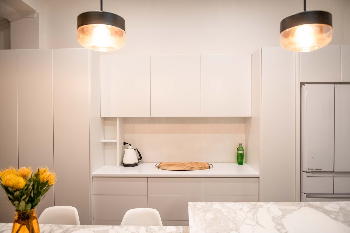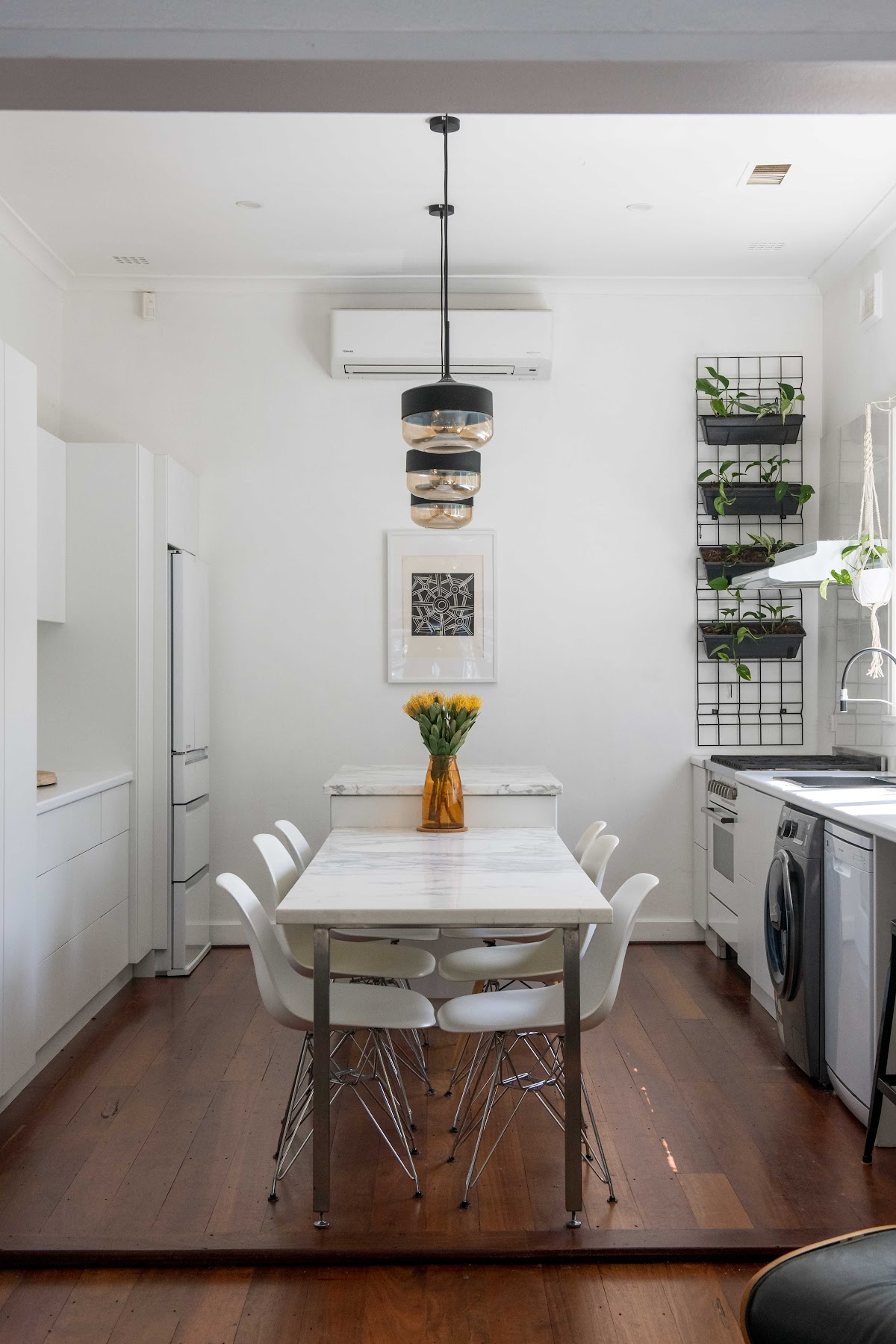 Beautifully renovated chef’s kitchen boasts a freestanding gas stove, under bench wine/champagne fridge, dishwasher, and a very classy solid marble fixed dining table