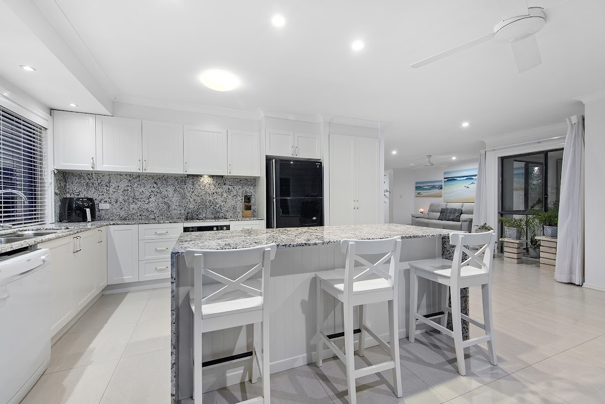 A thoughtfully designed kitchen features real Granite benchtops & Splashback complimented by quality appliances and a large Pantry that will have even the fussiest of chef’s keen to showcase their culinary skills. The central Breakfast Bar with its waterfall sides is a showcase feature on its own.