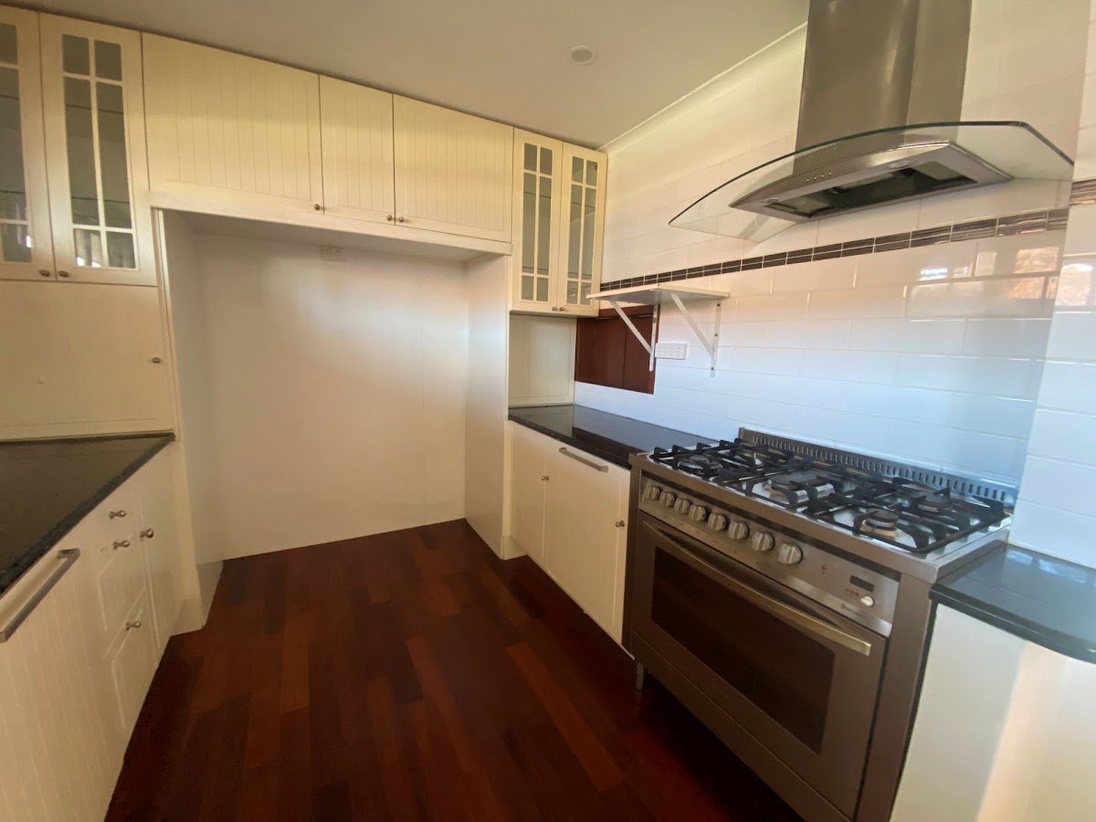 • Expansive kitchen with ample countertop space, featuring a freestanding 90cm gas cooktop and oven, stainless steel rangehood, Bosch dishwasher, double bowl under-mount sinks, double fridge recess, and a convenient breakfast bar seating area.