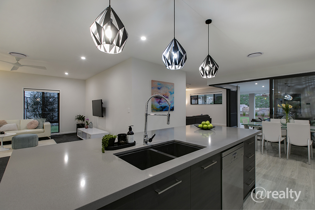 Through the modern oversized front door entrance this home quite literally unfolds with the study to your right and welcoming hallway through to the rear of the home to the open plan living and dining adjacent a superb chef’s kitchen. With a substantial ‘island style’ breakfast bar and tasteful café lighting, stone benchtops, glass splashbacks and cabinetry in abundance with the walk in pantry, this is a creative space that has no limits. Quality stainless steel appliances, an induction cooktop and double fridge space all make the hub of the home a welcoming space.