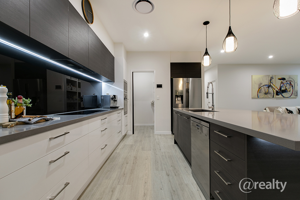 Through the modern oversized pivot front door entrance this home quite literally unfolds with the study to your right (complete with built in cabinetry) and welcoming hallway through to the rear of the home to the open plan living and dining adjacent a superb chef’s kitchen. With a substantial ‘island style’ breakfast bar and tasteful café lighting, stone benchtops, glass splashbacks and cabinetry in abundance with the walk in pantry, this is a creative space that has no limits. Quality stainless steel appliances, an induction cooktop and double fridge space all make the hub of the home a welcoming space.