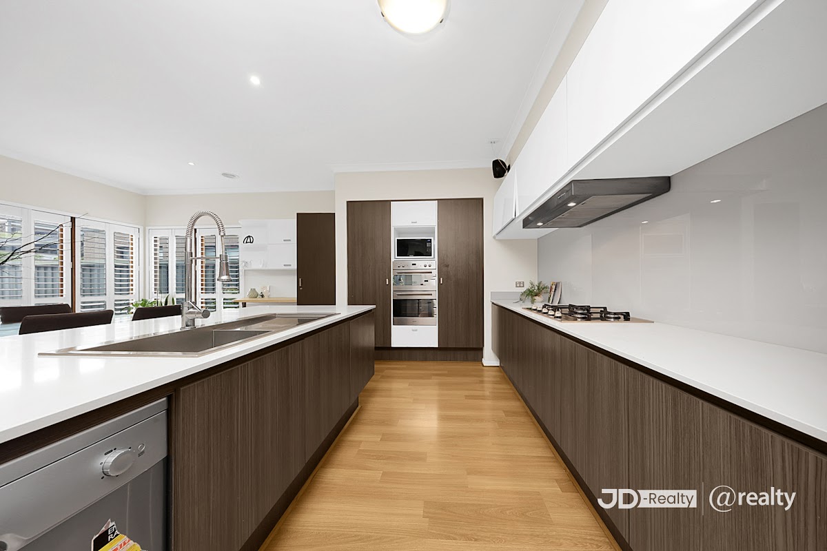 The main family room is both spacious and versatile – flowing through to the open dining, study nook and adjoining kitchen, which incorporates a built-in gas cooktop, double wall ovens, range hood, dishwasher and bench top with cupboards on both sides. The ample storage space in the property ensures a clutter-free and organised living and dining space.