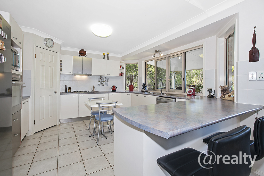 Making the most of its surroundings, this split level home has three wooden verandas to take in the views of Mt O’Reilly, Mt Nebo and Mt Glorious ranges. At entry level you walk into a home that is warm and inviting, with separate lounge and dining rooms that flow into the heart of the home – the open plan kitchen and family room.
